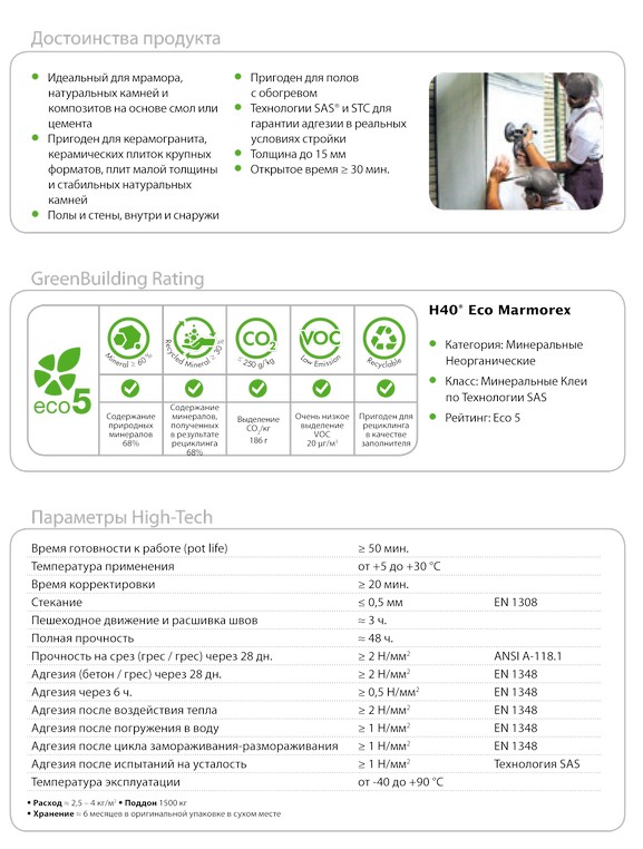 H40® Eco Marmorex обеспечивает очень быструю и высокую гидратацию, что связывает затворную воду и предупреждает образование поверхностных пятен, гарантируя безопасную укладку чуствительного мрамора и природного камня.