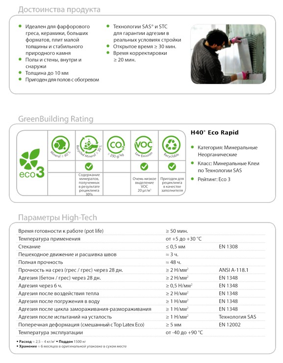 H40® Eco Rapid обеспечивает короткое время сдачи в эксплуатацию даже при низких температурах, гарантируя высокую адгезию, идеален как для ремонтных работ, так и в новых помещениях, сохраняя продлённую обрабатываемость, сравнимую с клеями с нормальным временем схватывания.