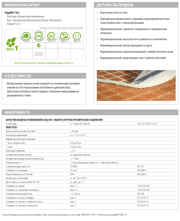 Органические Минеральные Шовные Заполнители для Керамики и Природного КамняСертифицированный, керамизированный, эко-совместимый шовный заполнитель повышенной обрабатываемости и лёгкости смывания, бактериостатический и фунгистатический, водонепроницаемый и пятностойкий, для швов шириной от 0 до 20 мм с повышенной химостойкостью, гарантирует непрерывность керамической облицовки, совершенный в GreenBuilding. Наинизшее выделение летучих органических соединений.
